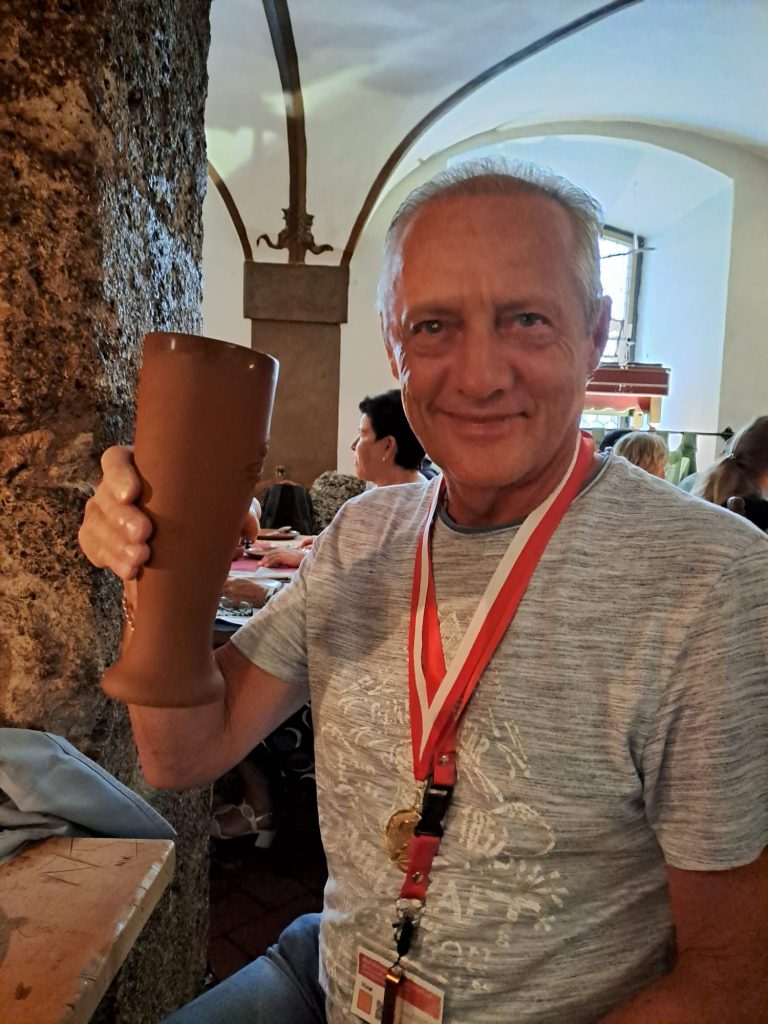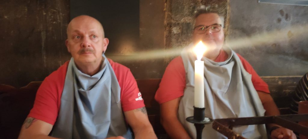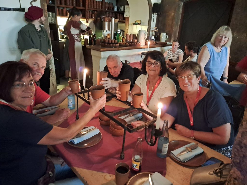 Klar ist, das so viel Adrenalin durch den Magen geht, drum haben wir zum Essen mal die Zeit zurückgedreht. Dabei haben sich unsere Essmanieren mal so richtig gefreut. Denn wir aßen und tranken wie die alten Rittersleut. Nachdem Jürgen und Ich uns zum Suppenkasper gemacht, haben alle über das Ritterschauspiel vom Präsidium gelacht.